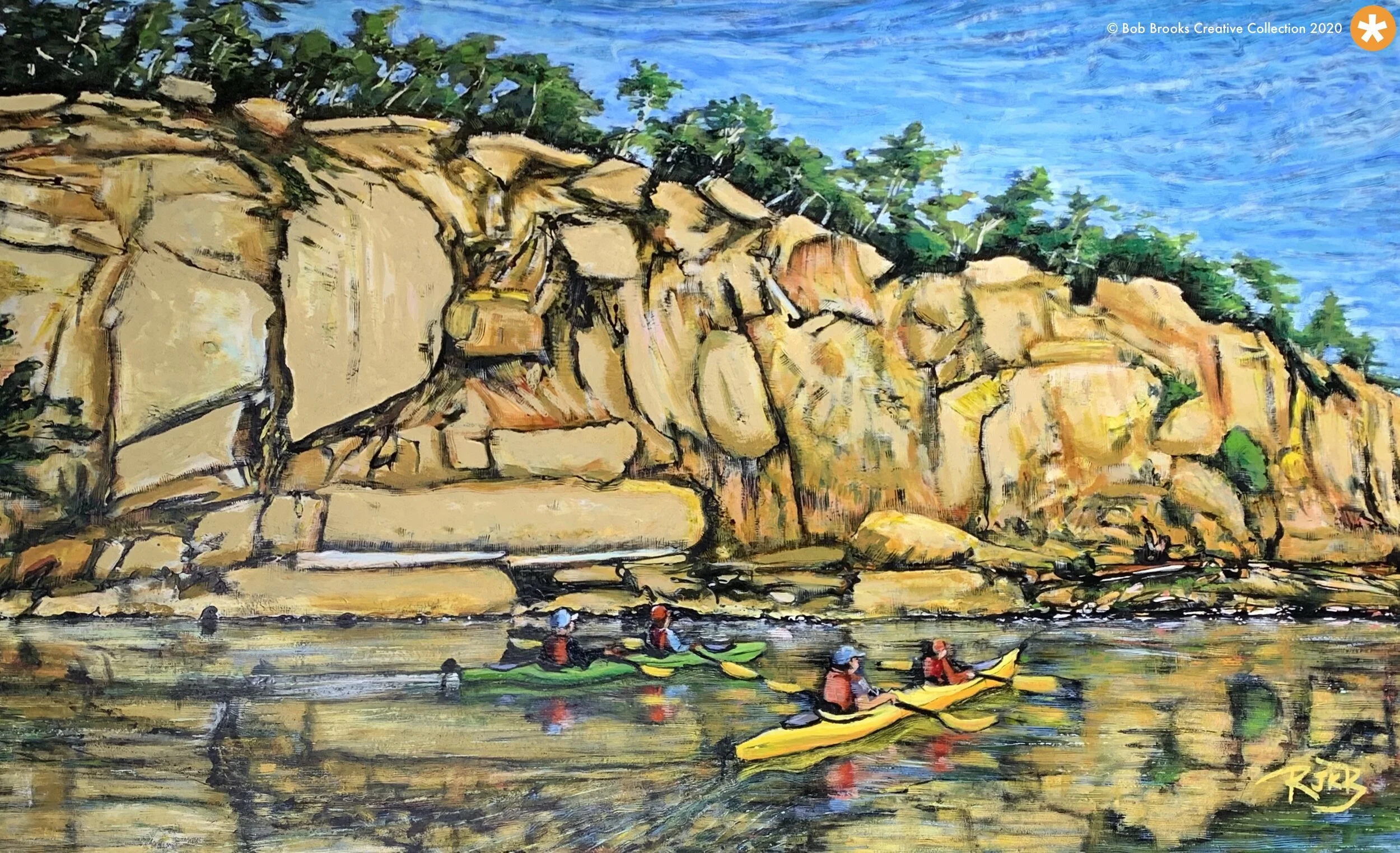 “‘De Courcy Island’ was created as a commission as a birthday gift for good friends who are are also avid kayakers. It was important to include the entire family in this piece as family and an outdoor lifestyle are so very important to them. Having had the opportunity to kayak De Courcy with I understand just how special this place is. Thank you for the opportunity to create this lasting memory!”