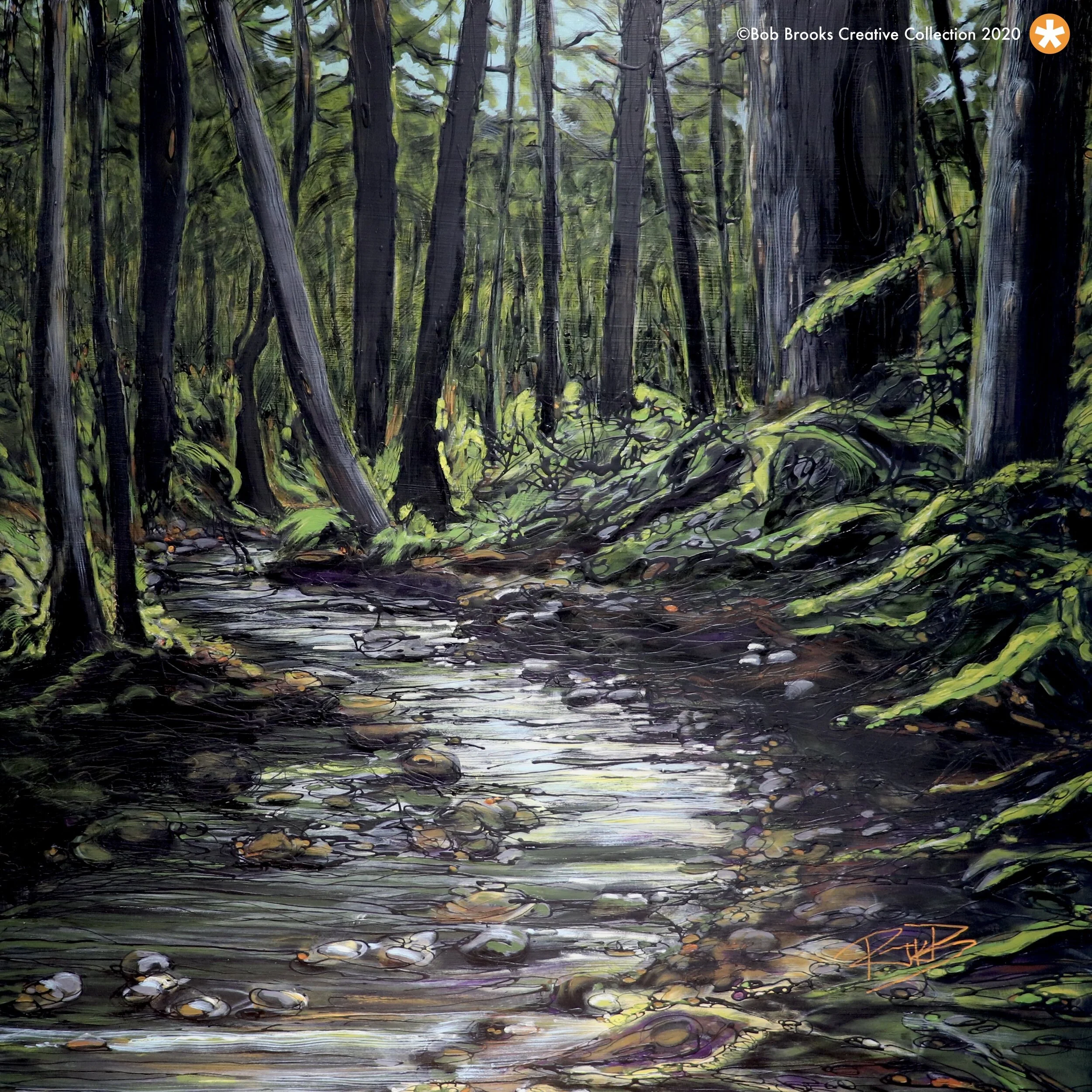 “Departure Creek is a very special piece to me. This part of the creek runs through what was once our home in Departure Bay. Some might think of this a dark detour for me and my typical fiery colour palette. If anything this peaceful space helped meant a lot to my family and at times it helped me cleanse my palette; providing for some calm and reflective moments during the chaos of the pandemic. ”